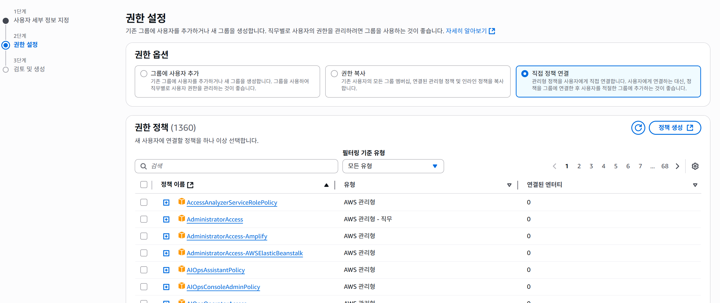 해당 사용자에게 부여할 수 있는 정책이 나오며 여기서 필요한 정책을 선택하면 된다.