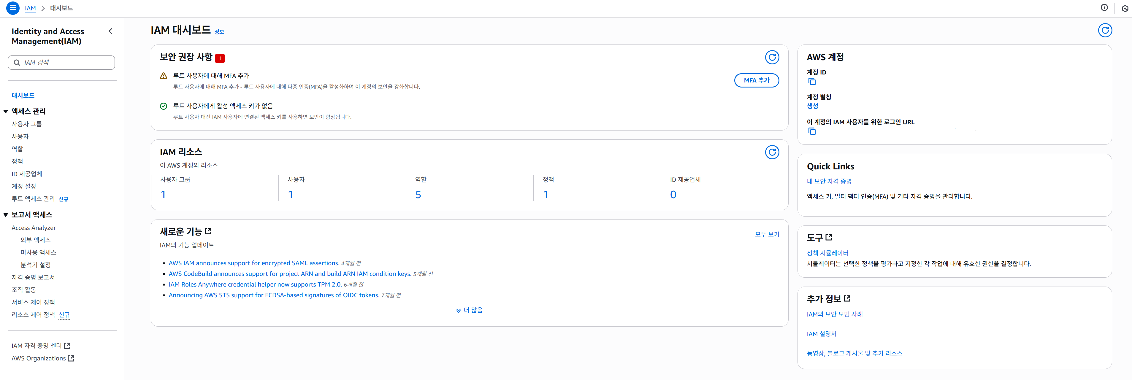 이 콘솔에서 검색하여 IAM 대시보드 페이지로 넘어간다.