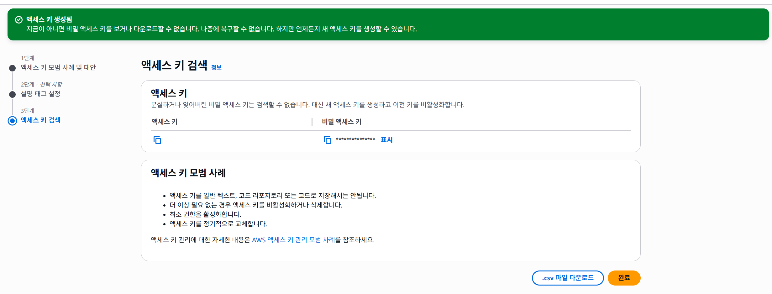 주의점 : 액세스 키는 다시 확인할 수 있지만, 비밀 액세스 키는 다시 확인 불가능. 이 화면에서 csv파일을 다운 받든, 확인하여 별도 파일로 저장해둘 필요가 있다. 만약 저장해둔 비밀 액세스 키를 분실하면 더 이상 해당 액세스키는 사용이 불가능하다.
