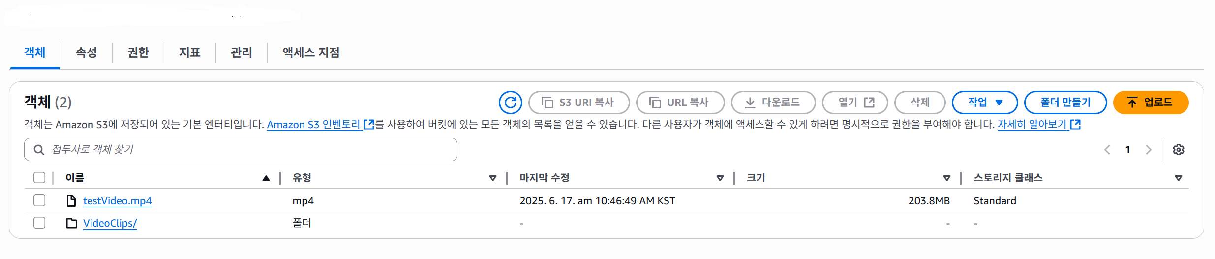 필자는 버킷 제일 위에 testVideo.mp4 라는 파일을 올려 테스트 해보았다.