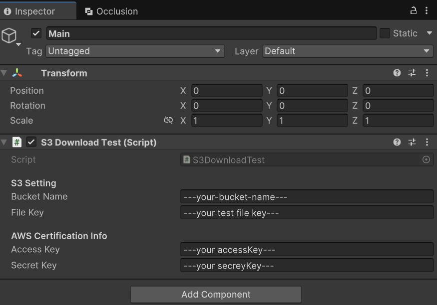 이 방법은 테스트 환경에서 유니티에서 s3를 통해 파일을 받아올 수 있는지 테스트 하기 위해서만 사용하기를 권장한다. 실 서비스에서 사용하려고 하면, 보안 측면에서의 위험이 매우 높다. 그렇기에 다음 포스트에서는 Key들이 빌드 파일에 없도록 구현하는 방법에 대해 다루어 보려고 한다.