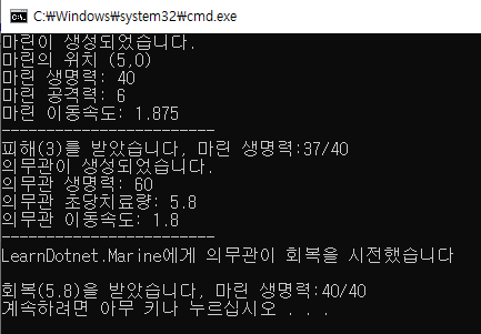 Console.WriteLine("회복({0})을 받았습니다, 마린 생명력:{1}/{2}",heal,this.hp,this.maxHp);