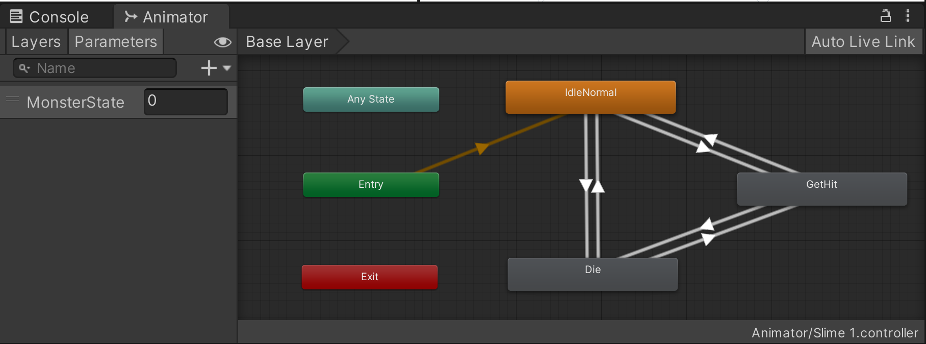 세가지 애니메이션을 사용, IdleNormal, GetHit, Die