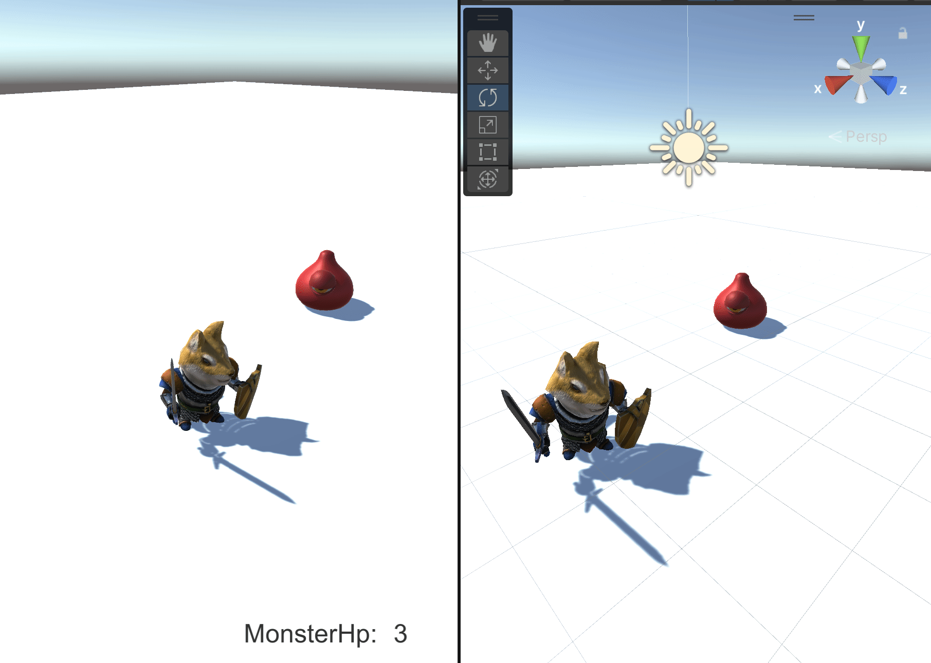 몬스터 슬라임의 hp를 3으로 잡고 가까이 몬스터에 접근하면 1회에 한하여 몬스터를 공격하도록 했다.