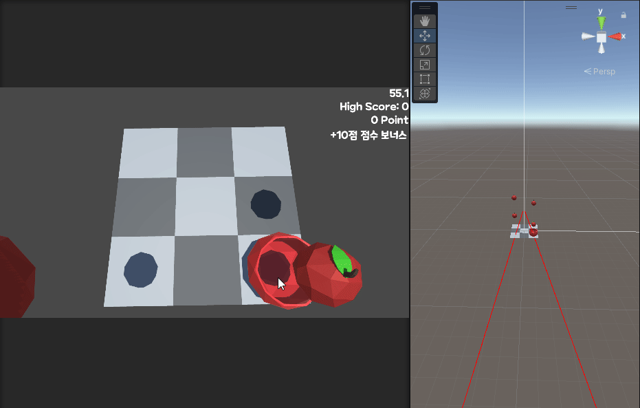 3.게임으로 들어가면, 사과아 폭탄이 떨어지는데, 기본적으로 사과를 먹으면 +100점, 폭탄을 먹으면 -50점