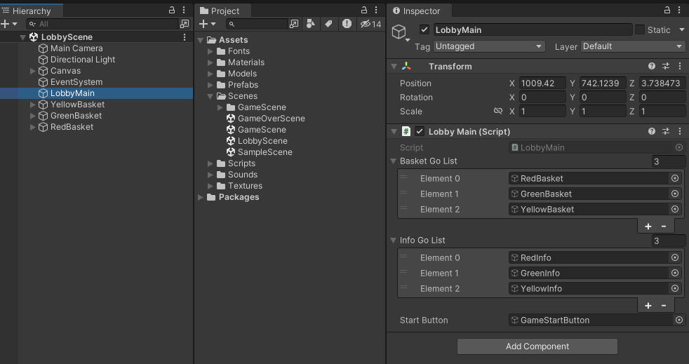 1-1. 사용되는 스크립트: LobbyMain, (InfoManager: 선택된 바구니의 타입을 저장받음) InfoManager는 마지막에 작성